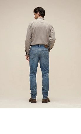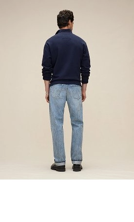 Wondering which jeans are your perfect fit? Let’s look at the differences. Our men’s straight jeans are one of the latest upgrades at BR. Taking in the leg from the knee to the hem, they have a slightly slimmer fit. Take our Relaxed Organic Cotton Jean, which is the most sustainable BR jean yet. Developed in partnership with the Ellen MacArthur Foundation's Jeans Redesign Challenge, we followed strict guidelines to source organic cotton denim from Italy's Candiani Mill, followed by innovative mushroom-derived finishing, and removed the rivets to create 100% recyclable jeans.